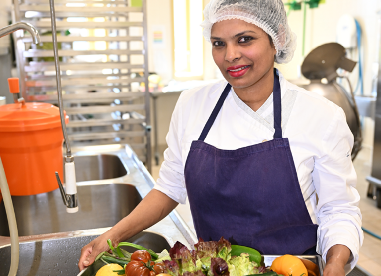 Sujatha Chandra travaille depuis sept ans à la cuisine centrale où elle a rejoint une équipe de dix-sept personnes. C’est là que sont préparés les repas pour les petites écoles maternelles et deux établissements primaires*, mais aussi pour les crèches municipales, le restaurant Schweitzer et le self des agents de la ville.