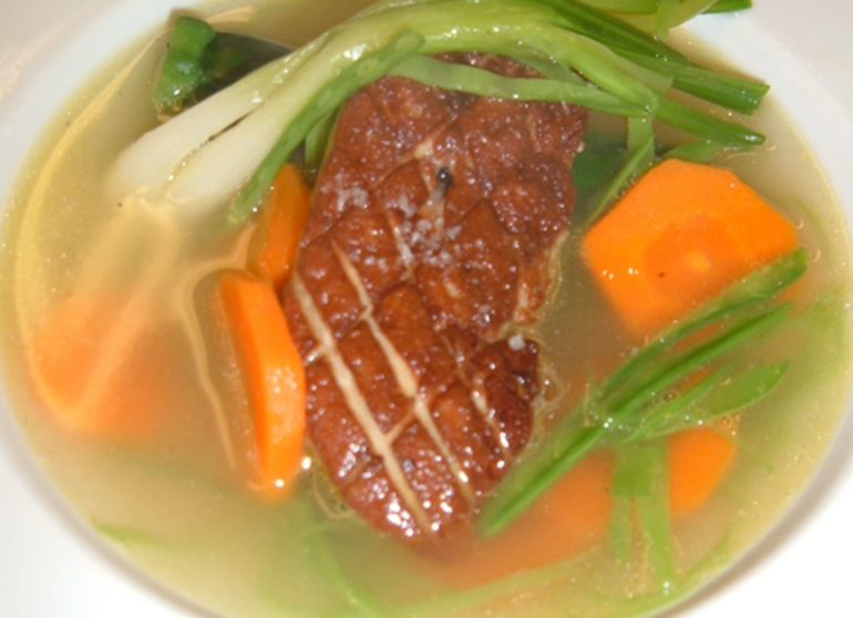 Quadriller les escalopes de foie gras avec le dos du couteau. Faire légèrement poêler le coté quadrillé pour obtenir une certaine caramélisation puis les plonger dans le bouillon avec les légumes et laisser cuire à frémissement pendant 2 minutes.