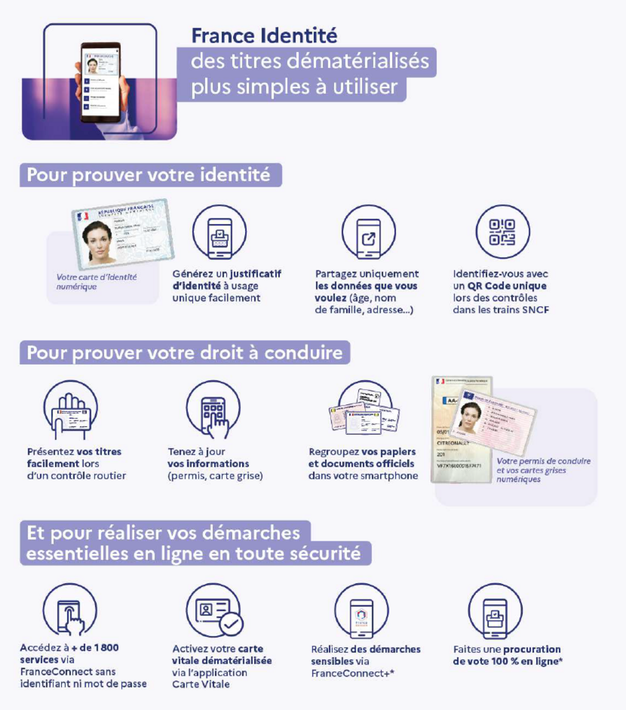 Vous pouvez aussi utiliser France Identité dans les trains TGV SNCF et Ouigo, importer votre permis de conduire et votre carte grise, accéder à votre carte Vitale numérique ou réaliser une procuration de vote 100% dématérialisée.